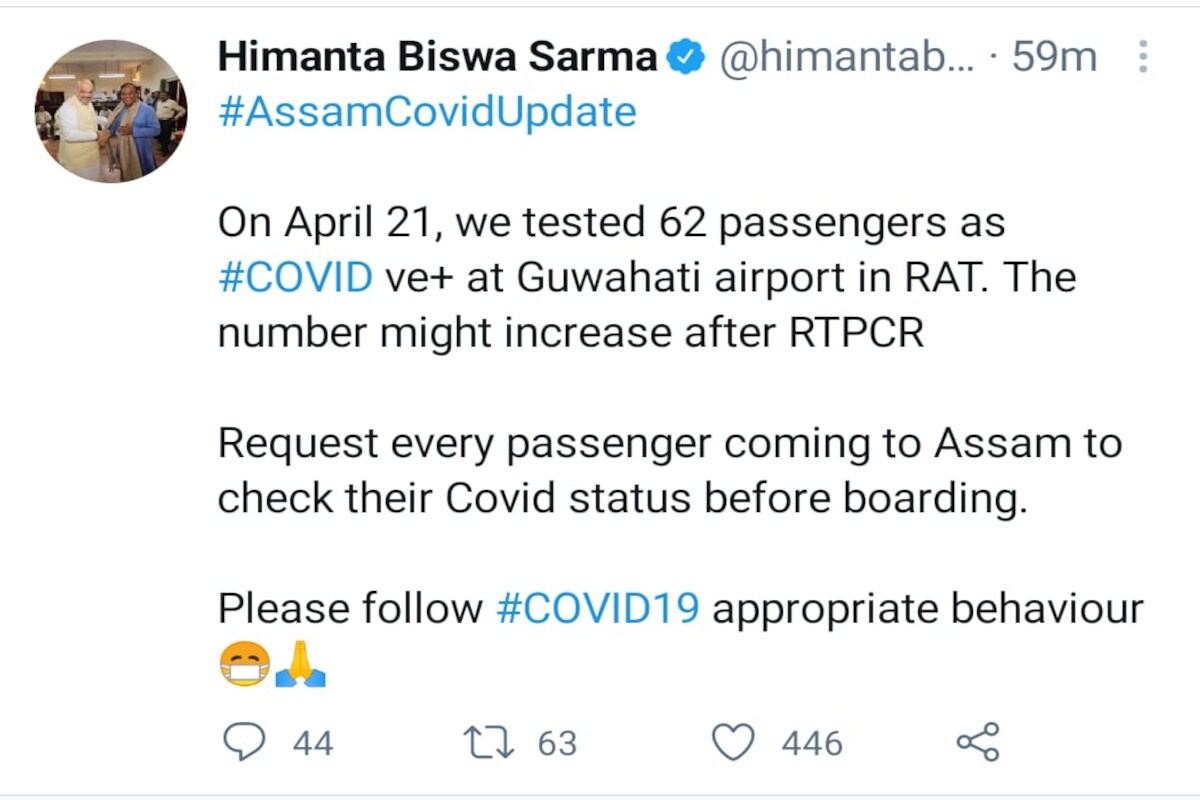 বহিঃৰাজ্যৰ যাত্ৰীক বিমানত উঠাৰ পূৰ্বেই Covid Test কৰাৰ আহ্বান জনাই মন্ত্ৰী হিমন্ত বিশ্ব শৰ্মাৰ টুইট।